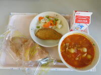 クロワッサン 牛乳 ミネストローネ 白身魚の香草フライ 彩りポテトサラダ