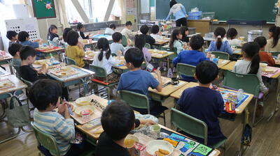 配膳の準備から、給食が楽しみで笑顔いっぱいの1年生でした。