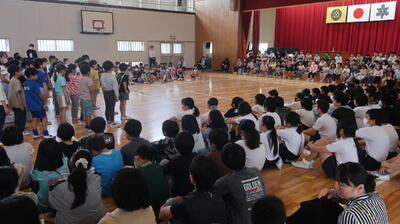 全校児童が体育館に集まり、1年生を歓迎しました。